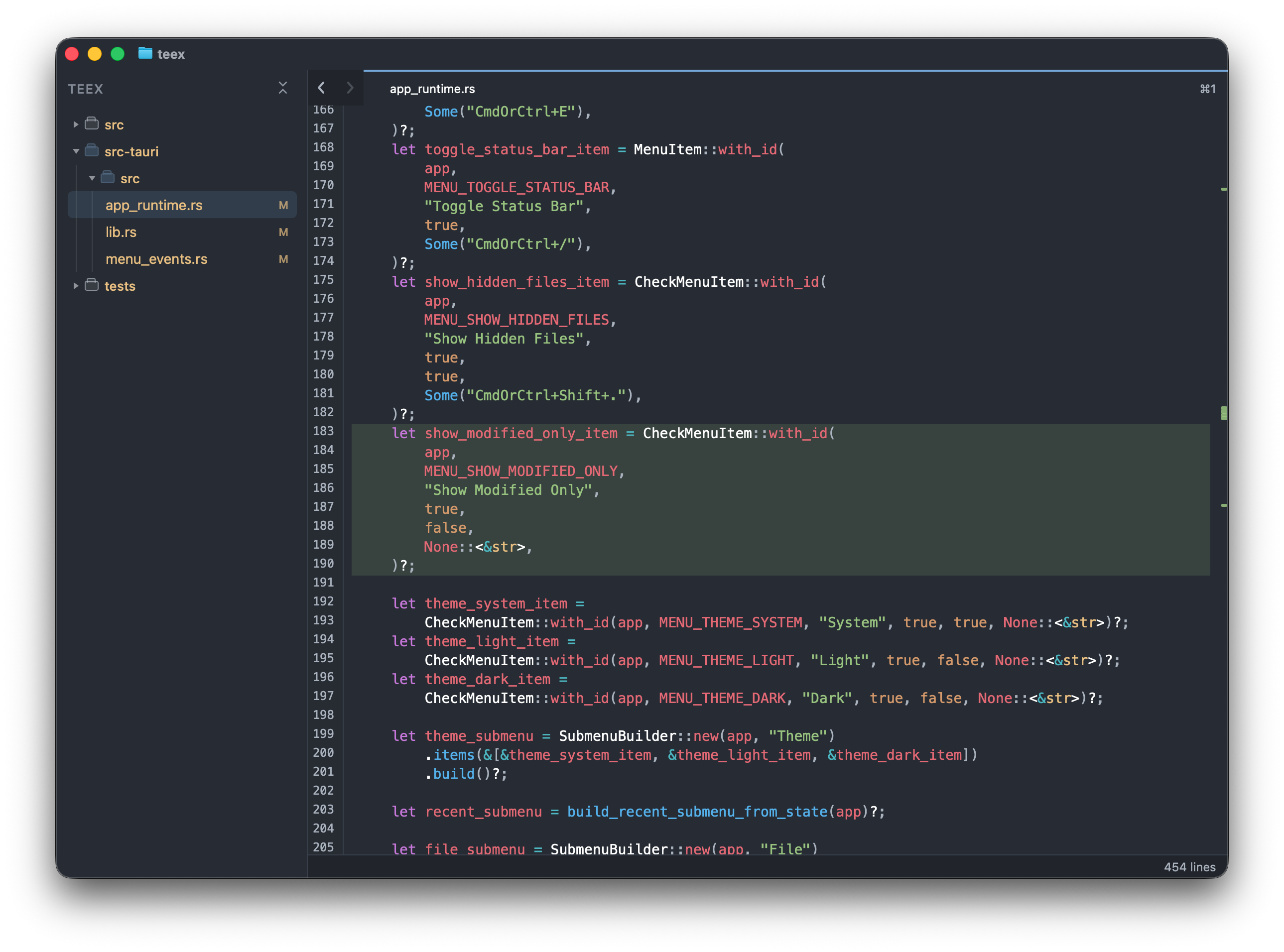 Teex showing a Rust source file with syntax highlighting and sidebar navigation